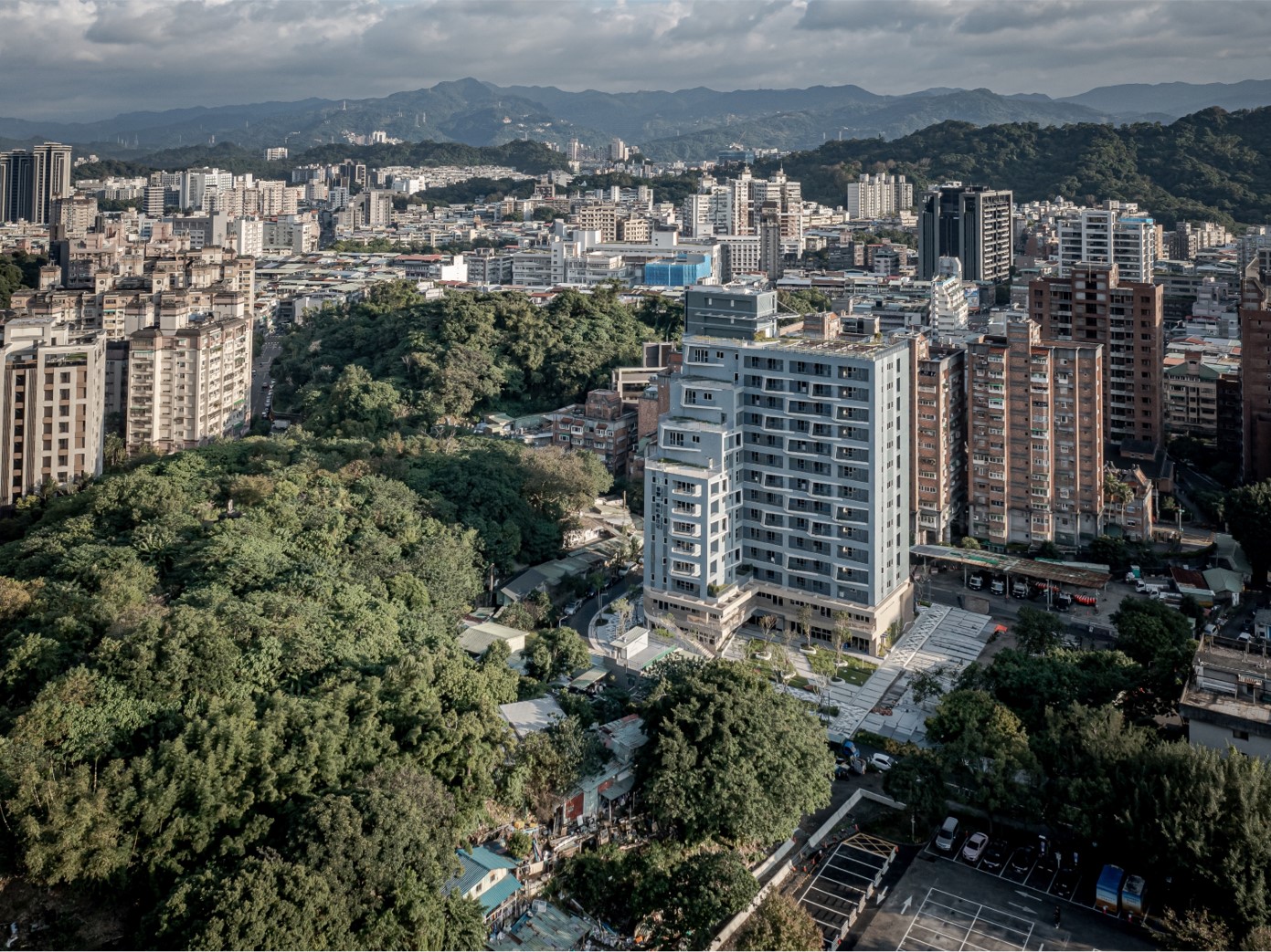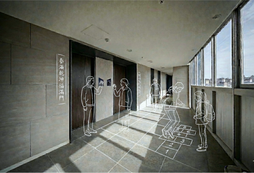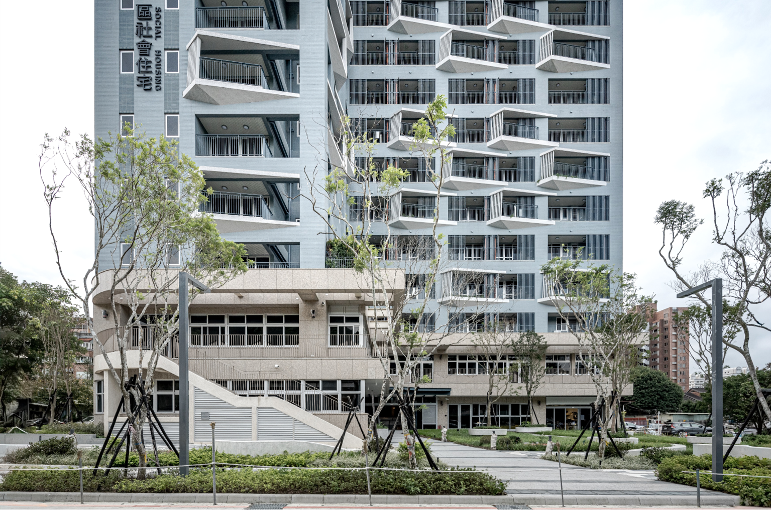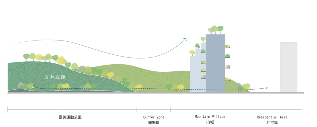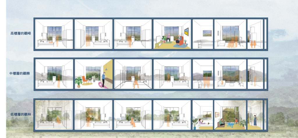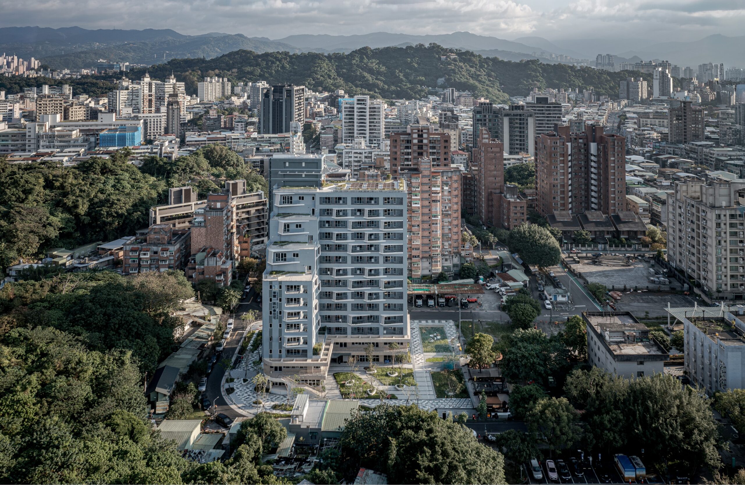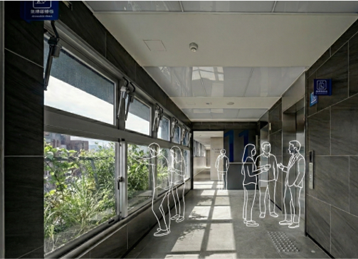 The site is close to the mountains and neighborhood parks in the Wenshan District, Taipei. The L-shape layout of building object brings all 90-units mountain view which is the most unique character of the site. There are eight-meter wide green open spaces around the site exception the west side where will be six-meter sidewalk connecting the second stage site of the social housing plan. There are also shops, plaza, and some reserved space, where is designed to integrate with the second stage space. It is the idea to increase the use efficiency and community interaction. The entrance of driveway is in the south to avoid the disturbance of residents. There is a semi-outdoor grand staircase which connects the social facilities in the second floor and increase the public accessibility. The semi-outdoor corridor of the social facilities is also designed to extended to the second stage one.