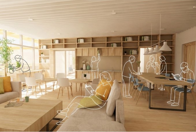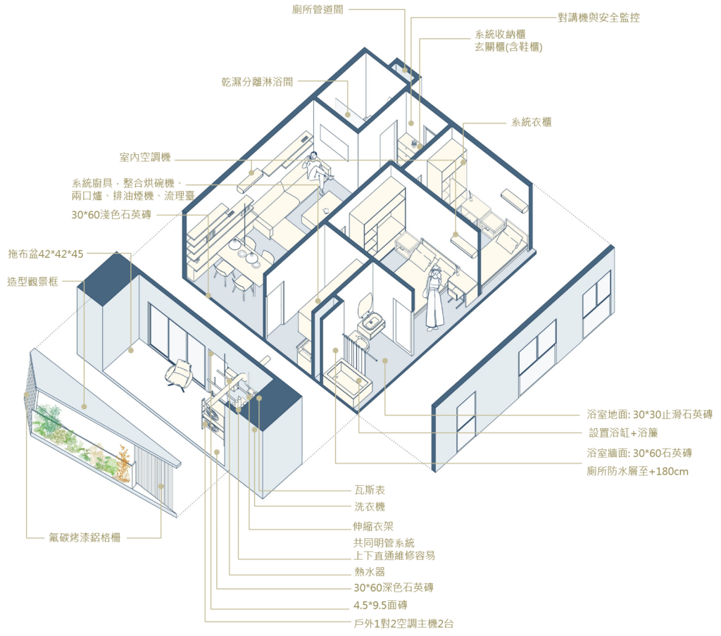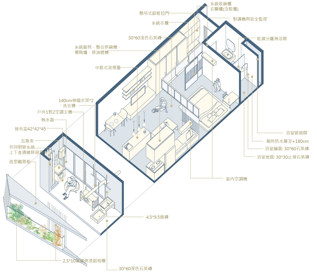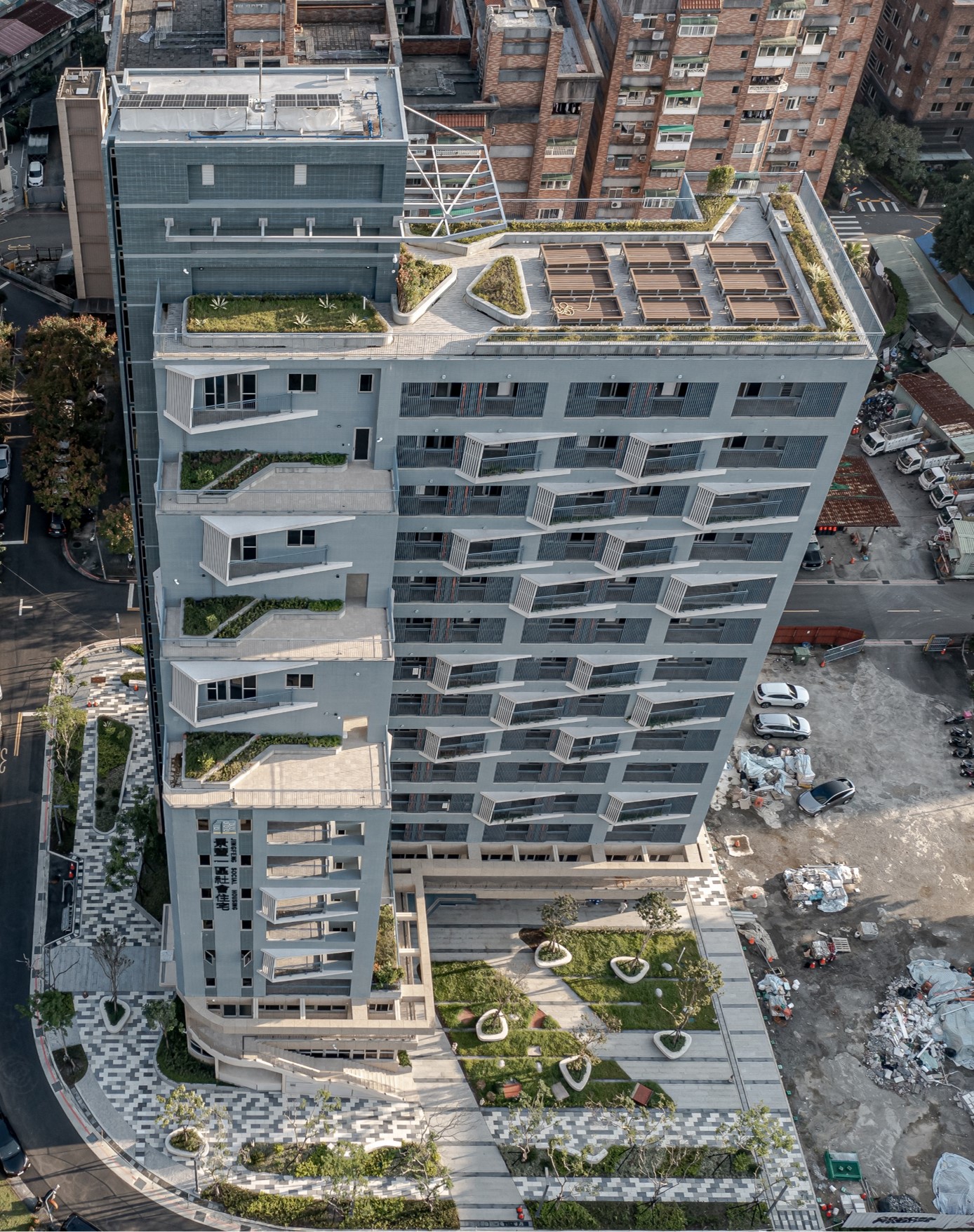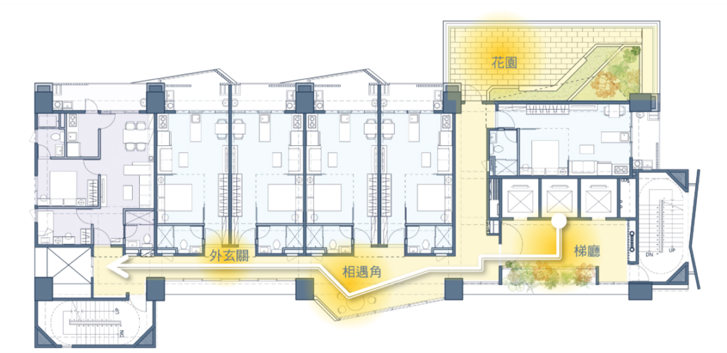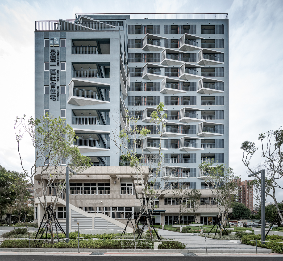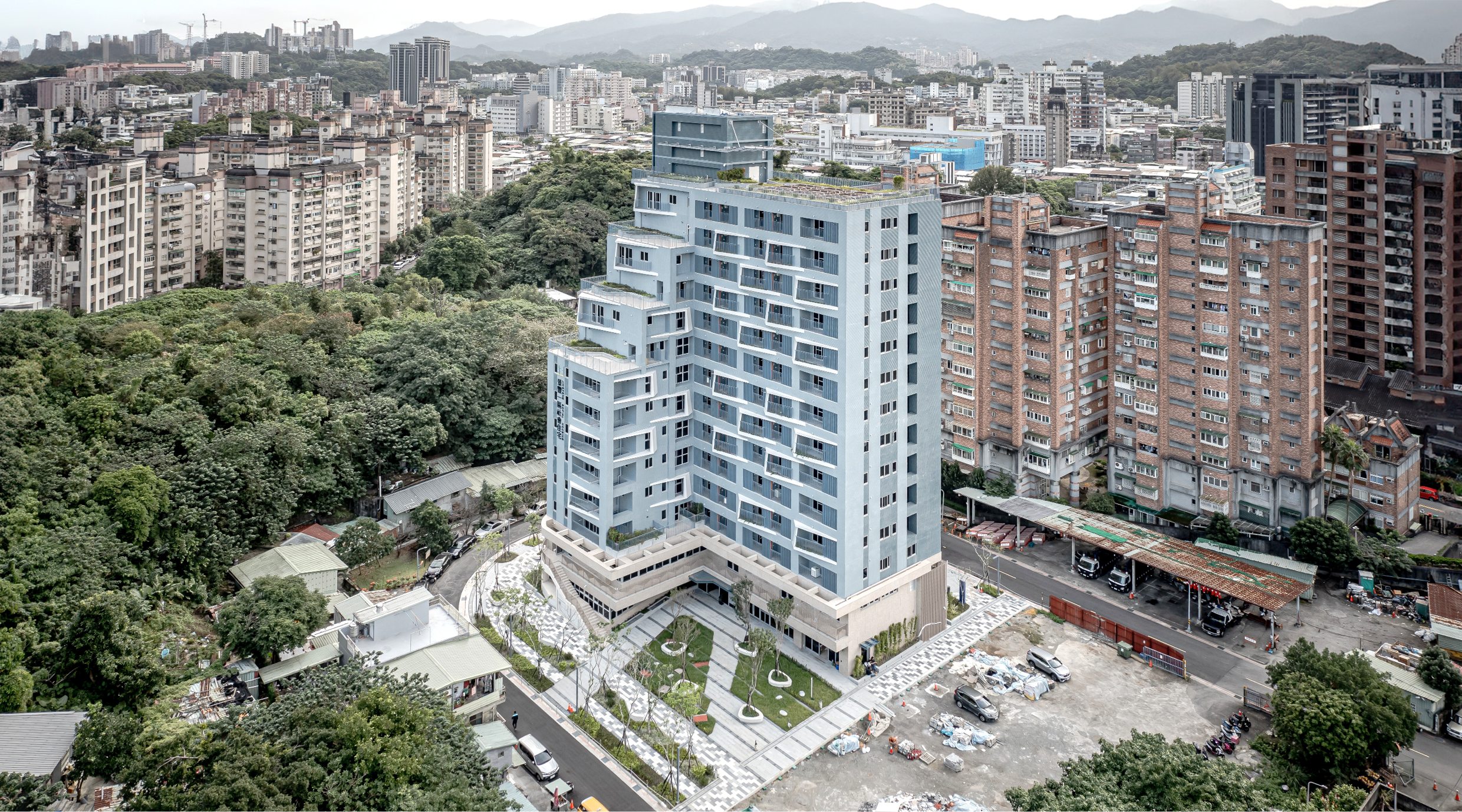 The site is close to the mountains and neighborhood parks in the Wenshan District, Taipei. The L-shape layout of building object brings all 90-units mountain view which is the most unique character of the site. There are eight-meter wide green open spaces around the site exception the west side where will be six-meter sidewalk connecting the second stage site of the social housing plan. There are also shops, plaza, and some reserved space, where is designed to integrate with the second stage space. It is the idea to increase the use efficiency and community interaction. The entrance of driveway is in the south to avoid the disturbance of residents. There is a semi-outdoor grand staircase which connects the social facilities in the second floor and increase the public accessibility. The semi-outdoor corridor of the social facilities is also designed to extended to the second stage one.