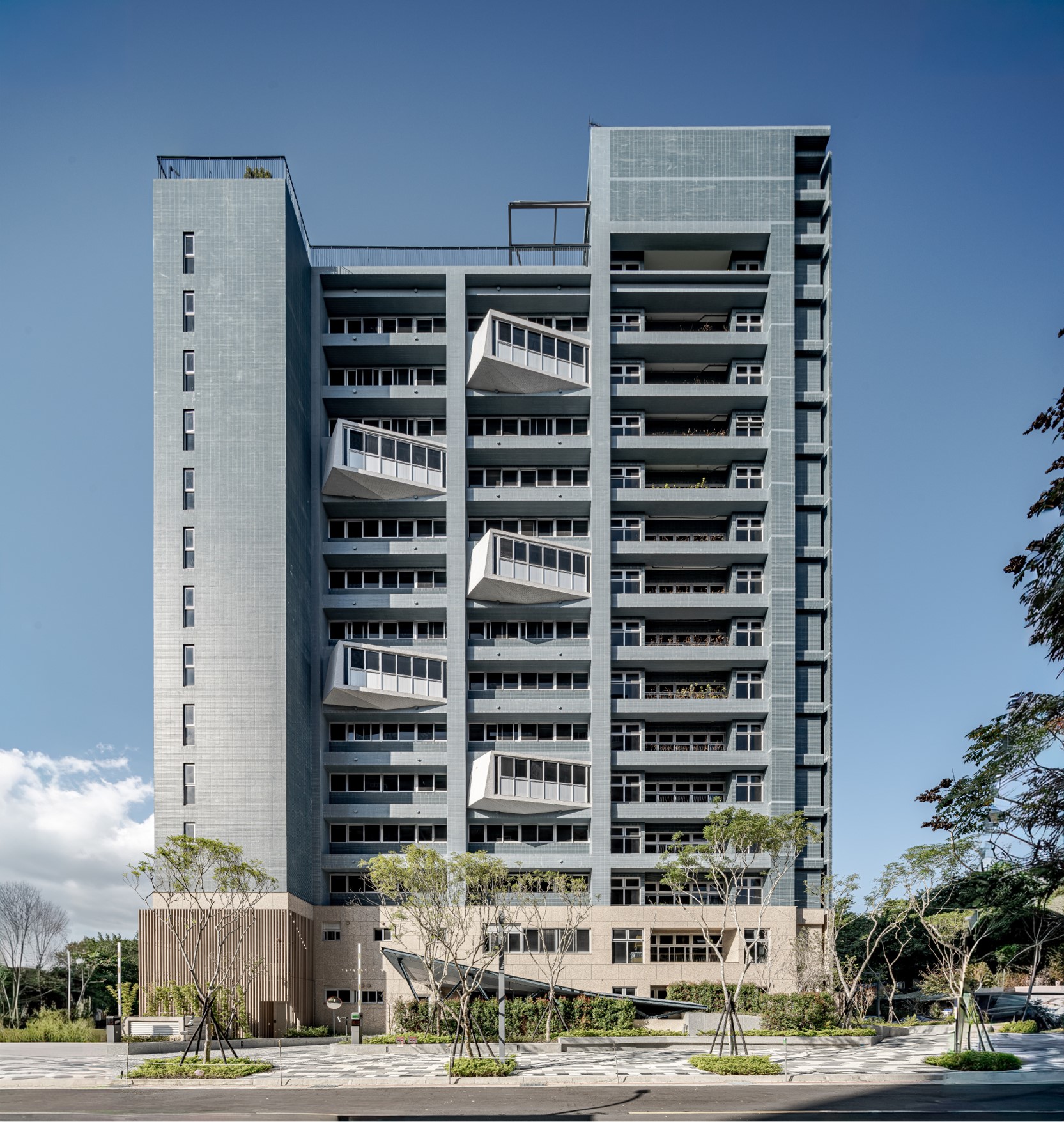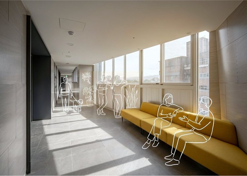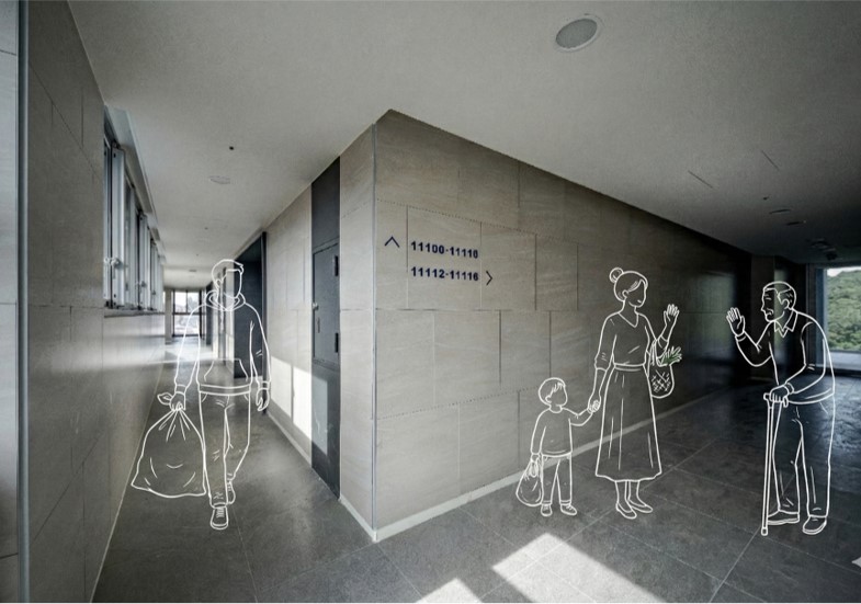 The mountain scenery varies with different level from each unit. There is a “meeting corner” at each floor in the corridor of residence floors. It is designed to keep people staying and increases the interaction of community. It is also an extend of the residence unit and incorporated into the façade. Green and leisure space are created by setback of the building object and connection to the nearby green landscape.